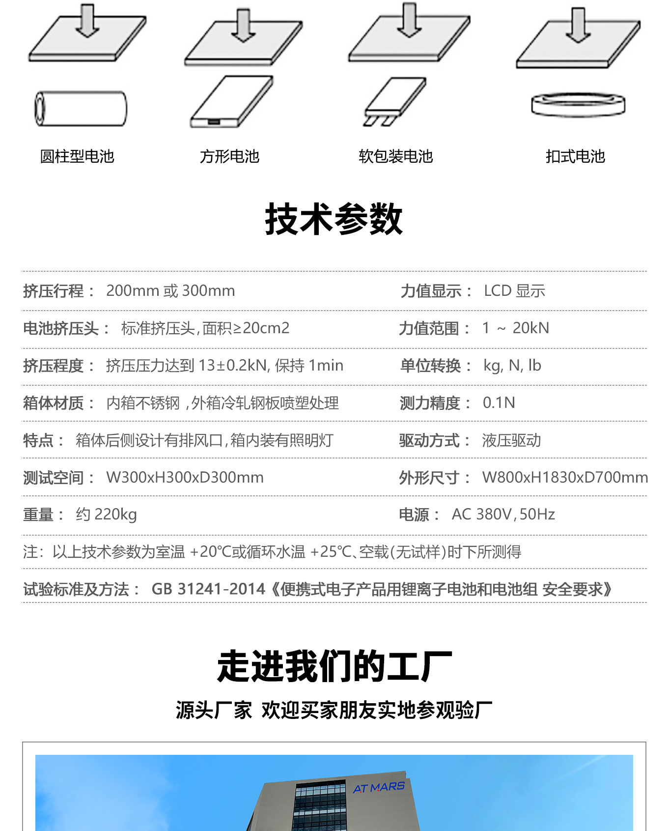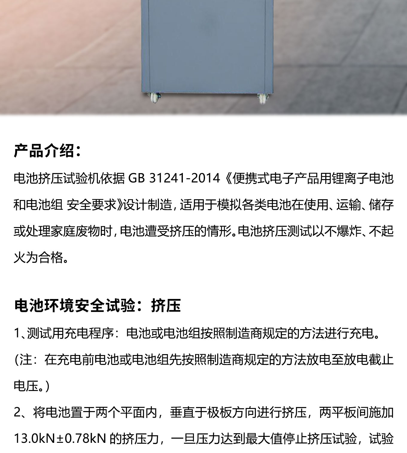 電池擠壓試驗機適用於模擬各類電池在使用、運輸、儲存或處理家庭廢物時,電池遭受擠壓的情形。麻豆精品在线電池擠壓試驗機滿足GB31241-2014標準中關於電池擠壓試驗要求。