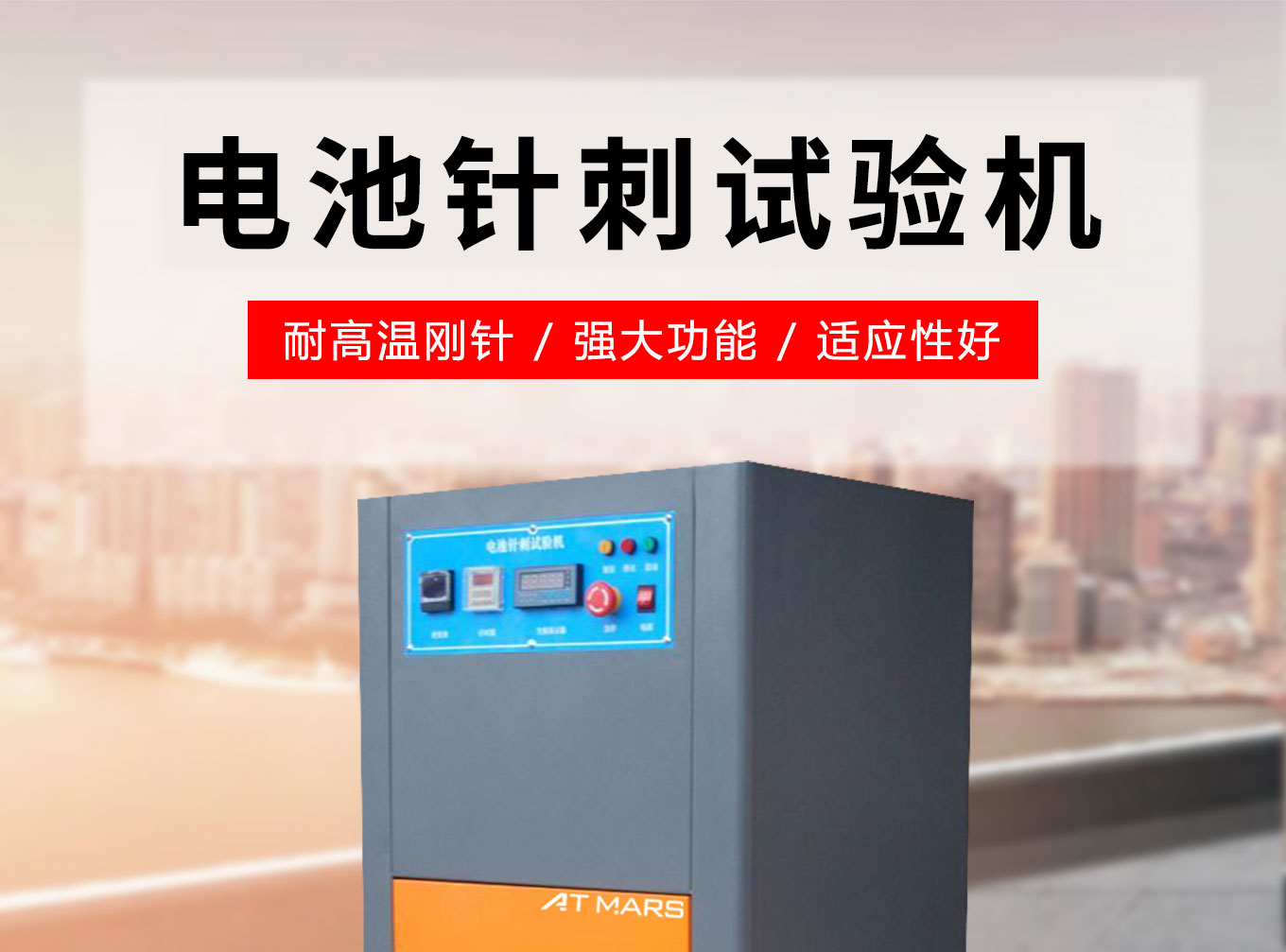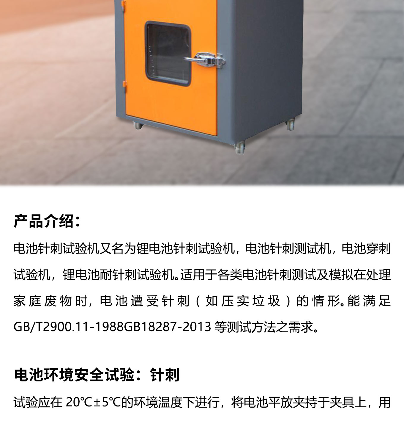 電池針刺試驗機又名為鋰電池針刺試驗機,電池針刺測試機,電池穿刺試驗機,鋰電池耐針刺試驗機。適用於各類電池針刺測試及模擬在處理家庭廢物時,電池遭受針刺(如壓實垃圾)的情形。能滿足GB/T2900.11-1988GB18287-2013等測試方法之需求。