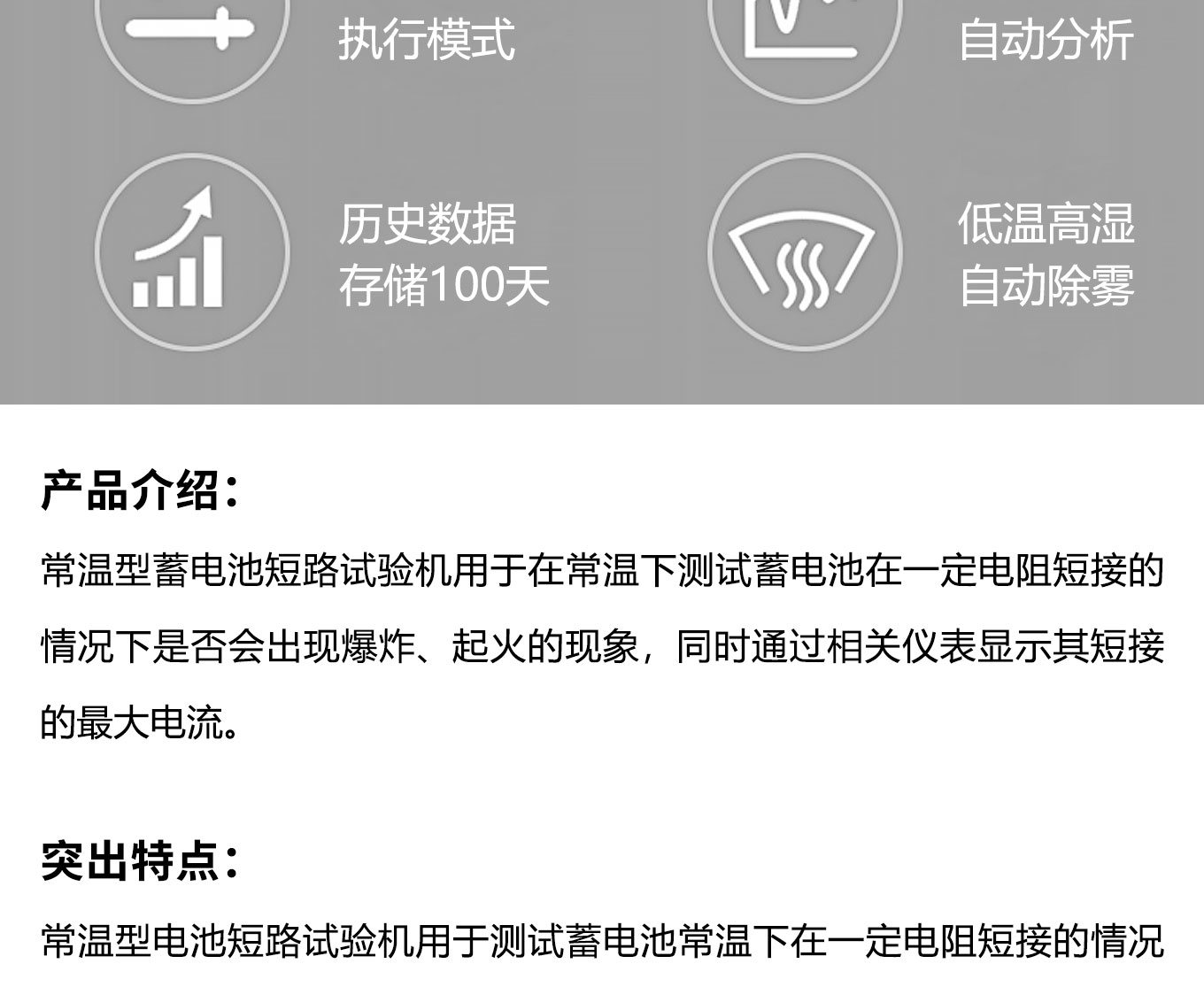常溫型蓄電池短路試驗機用於在常溫下測試蓄電池在一定電阻短接的情況下是否會出現爆炸、起火的現象,同時通過相關儀表顯示其短接的最大電流。