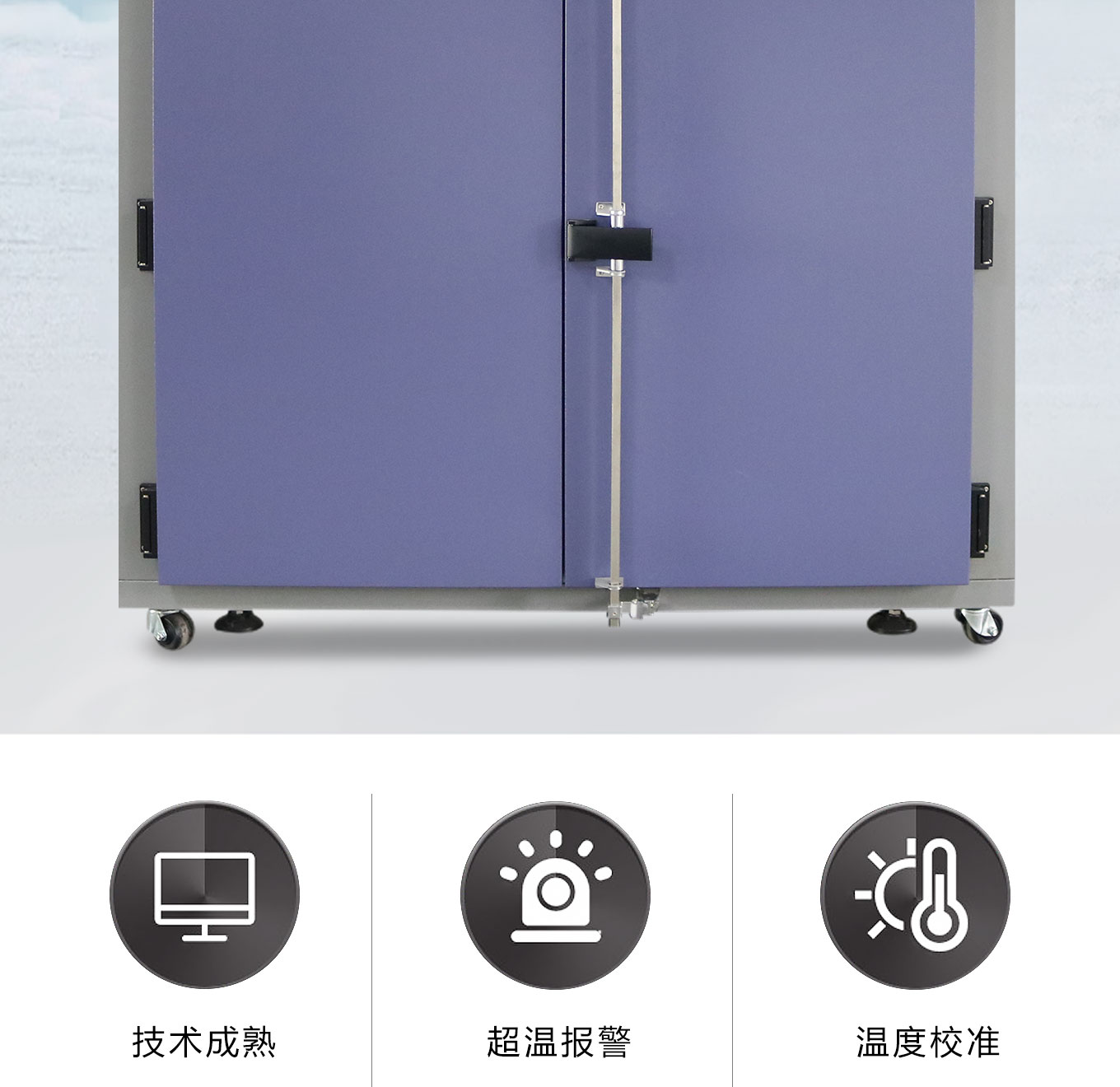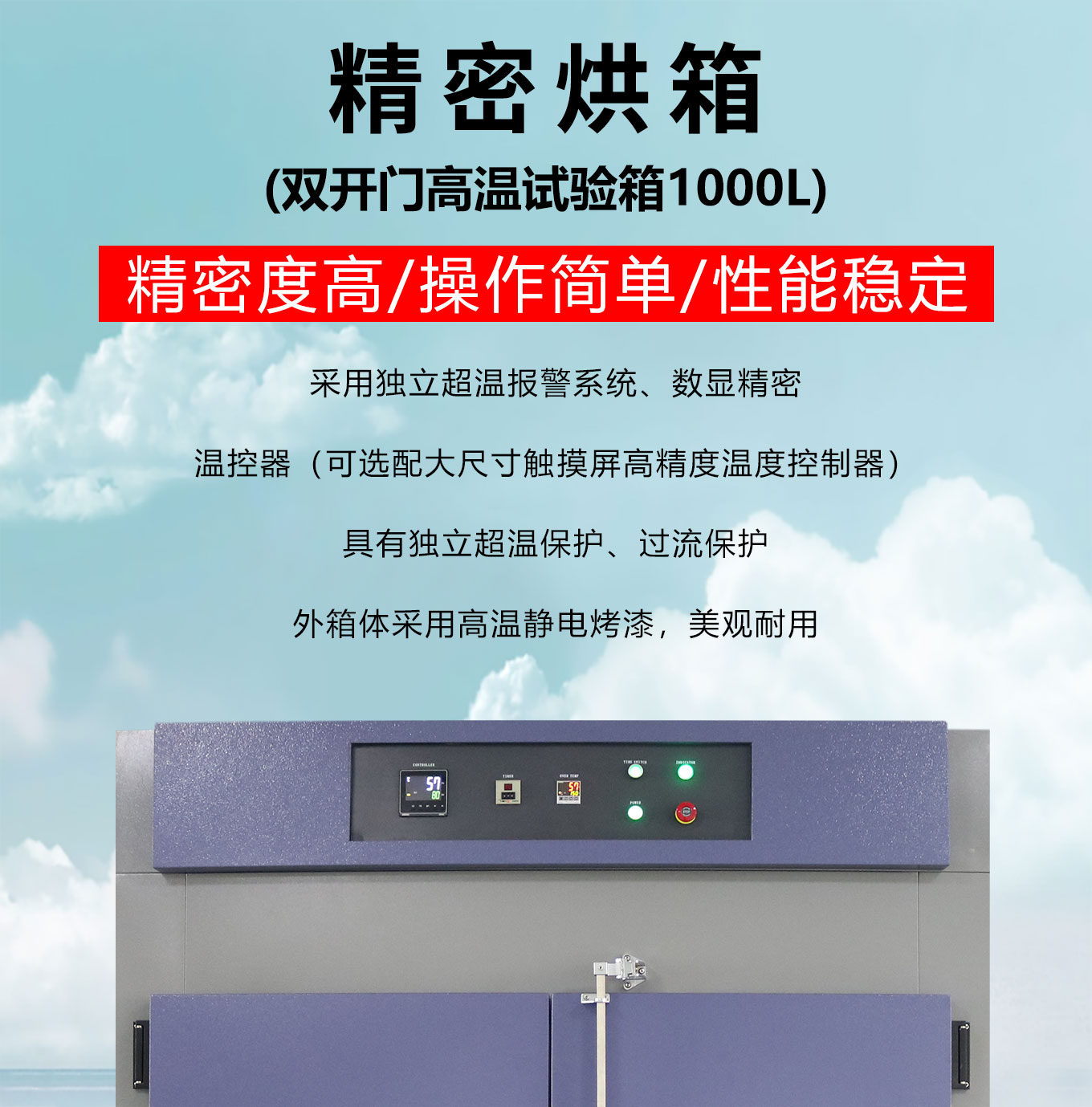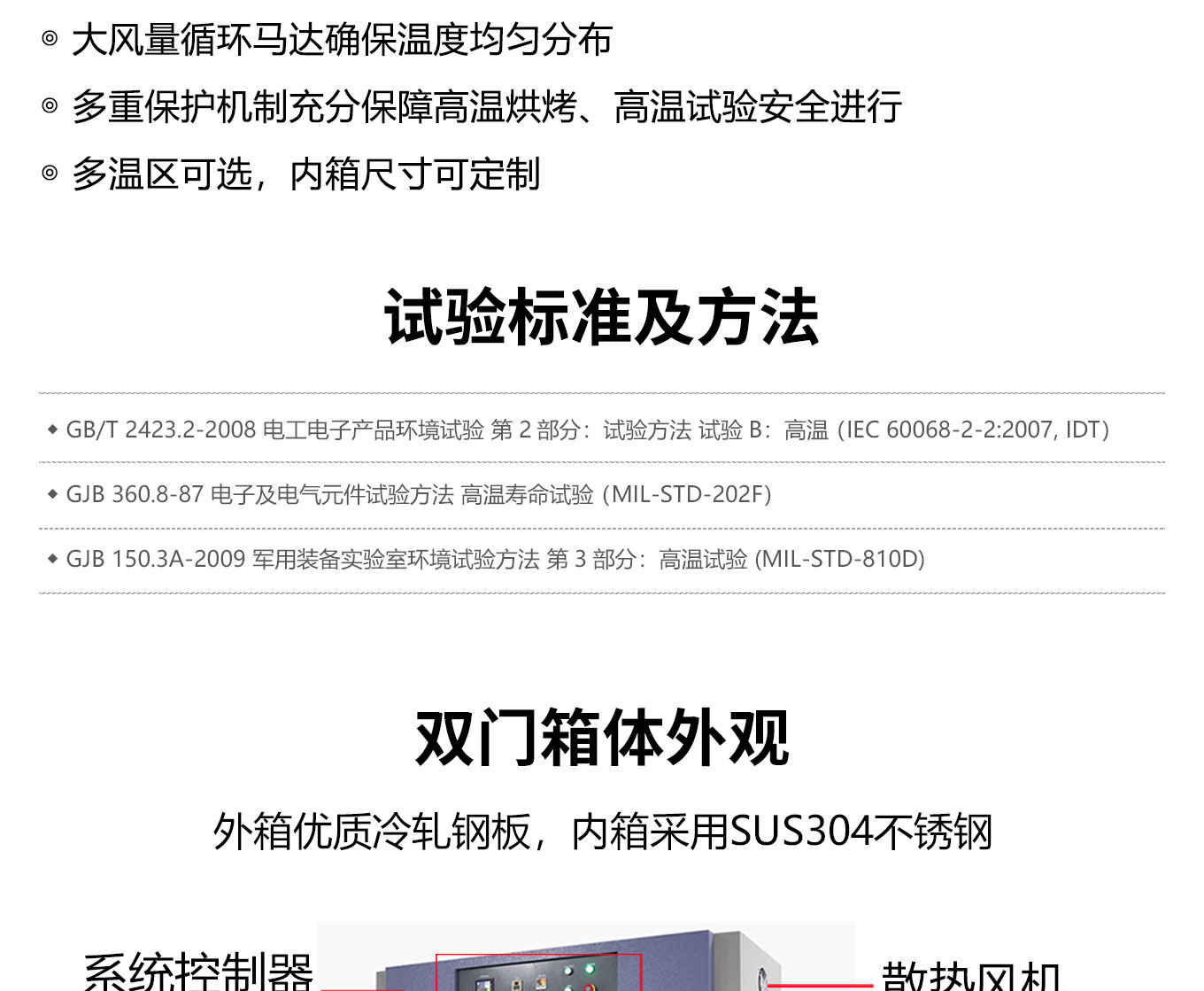 對開門設計方便大尺寸試品進出;緊湊型機箱結構占地麵積小;采用獨立超溫報警係統、數顯精密溫控器(可選配大尺寸觸摸屏高精度溫度控製器);大風量循環馬達確保溫度均勻分布;多重保護機製充分保障高溫烘烤、高溫試驗安全進行;多溫區可選,內箱尺寸可定製