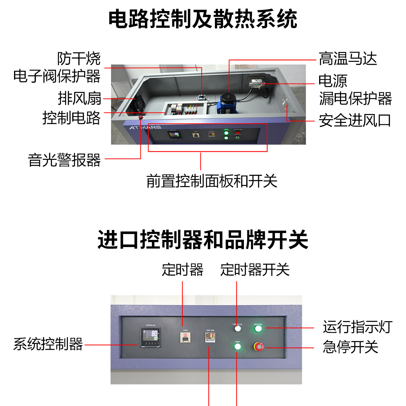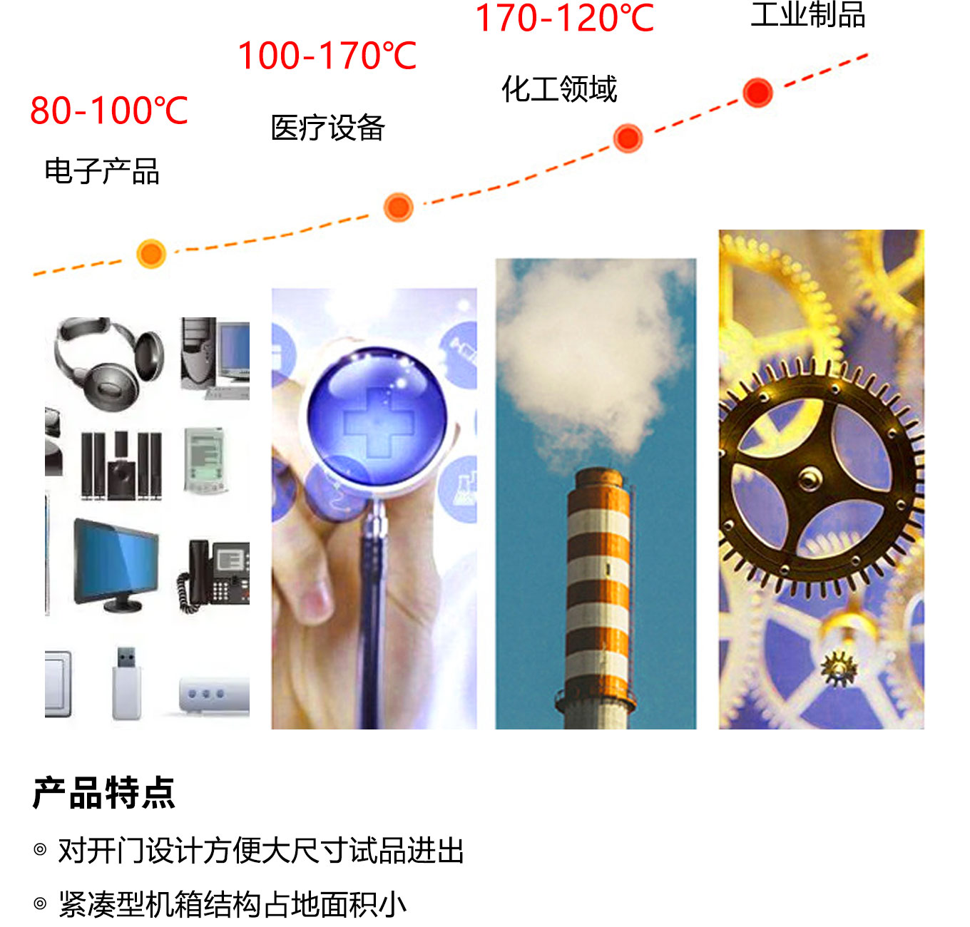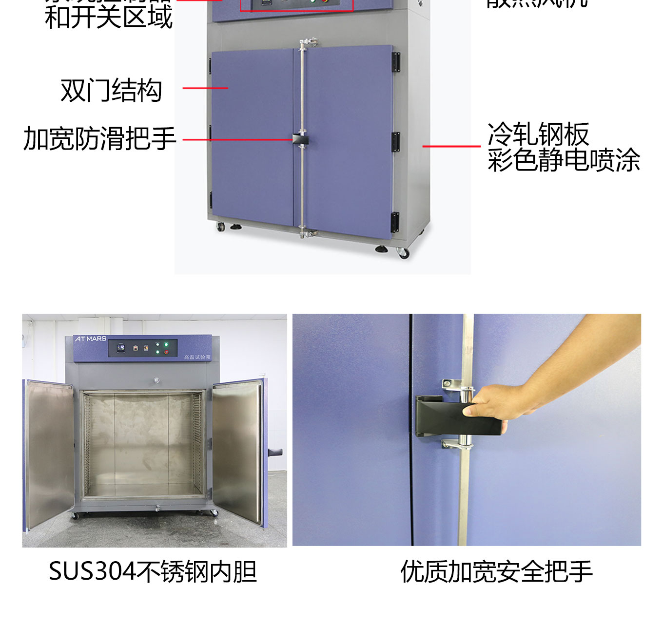 對開門設計方便大尺寸試品進出;緊湊型機箱結構占地麵積小;采用獨立超溫報警係統、數顯精密溫控器(可選配大尺寸觸摸屏高精度溫度控製器);大風量循環馬達確保溫度均勻分布;多重保護機製充分保障高溫烘烤、高溫試驗安全進行;多溫區可選,內箱尺寸可定製